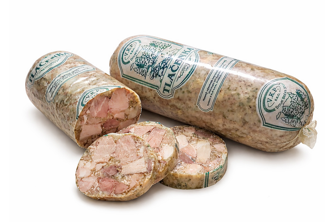 vepřové maso, pitná voda, vepřové droby, vepřová kůže, jedlá jodidovaná sůl, pepř, majoránka, česnek, nejedlý obal.